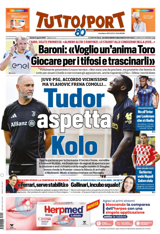 Infine, 'Tuttosport' oggi in edicola, in prima pagina, apre con la Juventus. Tudor aspetta Kolo Muani. No all'Inter per Lookman che si ribella. Guiterrez vede il Napoli. Sohm viola.