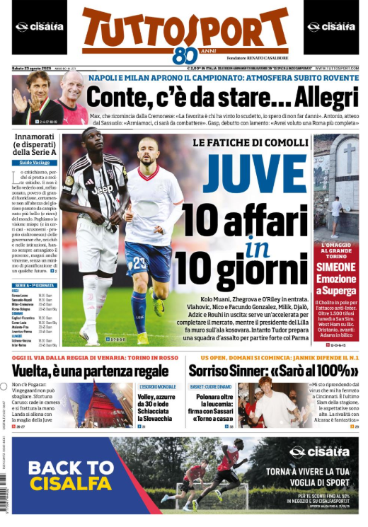 Infine, 'Tuttosport' oggi in edicola, in prima pagina, apre con il calciomercato. Juventus, 10 affari in 10 giorni. Napoli e Milan aprono il campionato: atmosfera subito rovente. Conte, c'è da stare... Allegri!