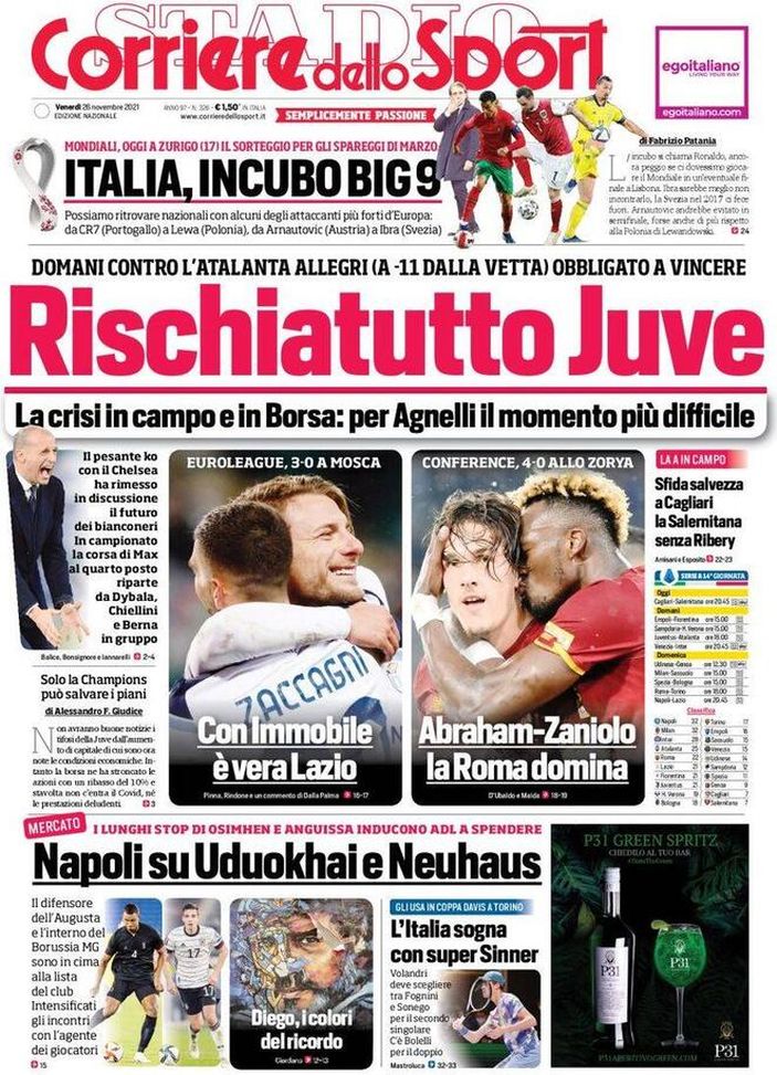 La prima pagina del 'Corriere dello Sport', in edicola oggi 26-11-2021