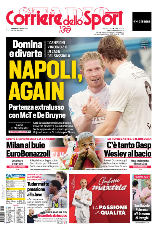 Il 'Corriere dello Sport' oggi in edicola, in prima pagina, apre con la Serie A. Napoli again. Milan al buio. EuroBonazzoli. C'è tanto Gasperini. Wesley al bacio. Tudor mette pressione alla Juventus. Spettacolo Palermo. Guardiola da incubo. PROSSIMA SCHEDA