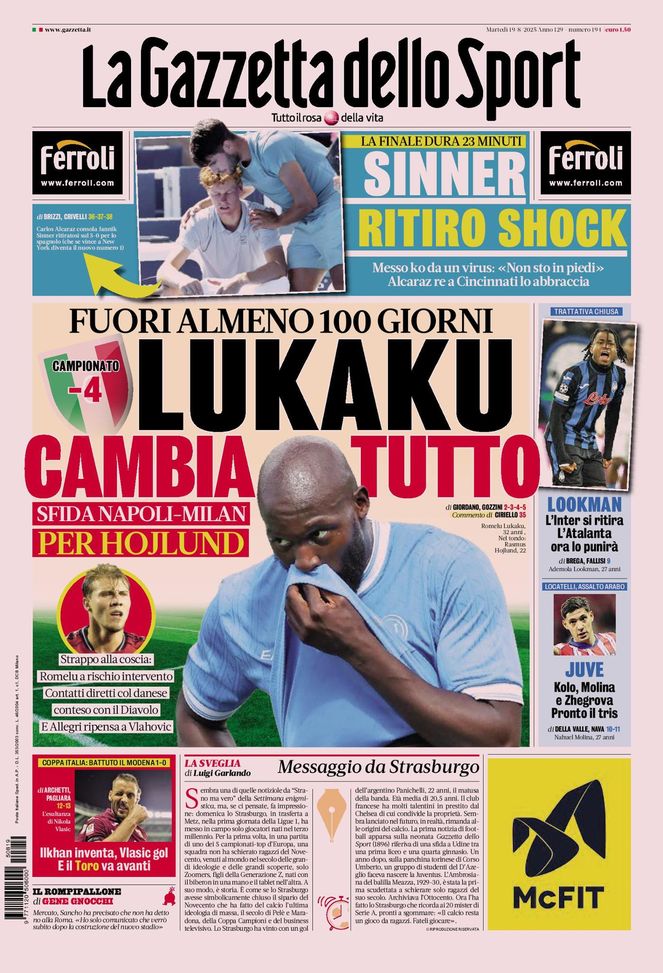 'La Gazzetta dello Sport' oggi in edicola, in prima pagina, apre con l'infortunio che terrà Romelu Lukaku, centravanti del Napoli, fuori almeno 100 giorni. Strappo alla coscia per il gigante belga e rischio operazione. Motivo per cui il club di Aurelio De Laurentiis si è inserito nella trattativa tra Manchester United e Milan per Rasmus Højlund.