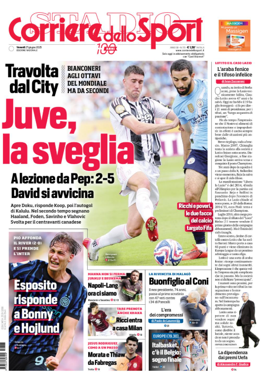 Il 'Corriere dello Sport' oggi in edicola, in prima pagina, apre con il Mondiale per Club, la Juventus crolla contro il City. Esposito risponde a Bonny e Hojlund. Napoli-Lang, ci siamo. Ricci entra a casa Milan, Morata e Thiaw da Fabregas. PROSSIMA SCHEDA