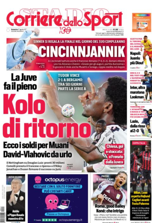 Il 'Corriere dello Sport' oggi in edicola, in prima pagina, apre con la Juventus. Kolo Muani di ritorno, ecco i soldi. Chiesa gol e stoccata. Milan, Leao aspetta Hojlund. Coppa Italia: Cagliari avanti. Festa Palermo. Roma, good Bailey. Koné che intrigo. Napoli, Juanlu più Douf. Inter altra maratona Lookman. Lazio, dalla rissa al 2-0. PROSSIMA SCHEDA