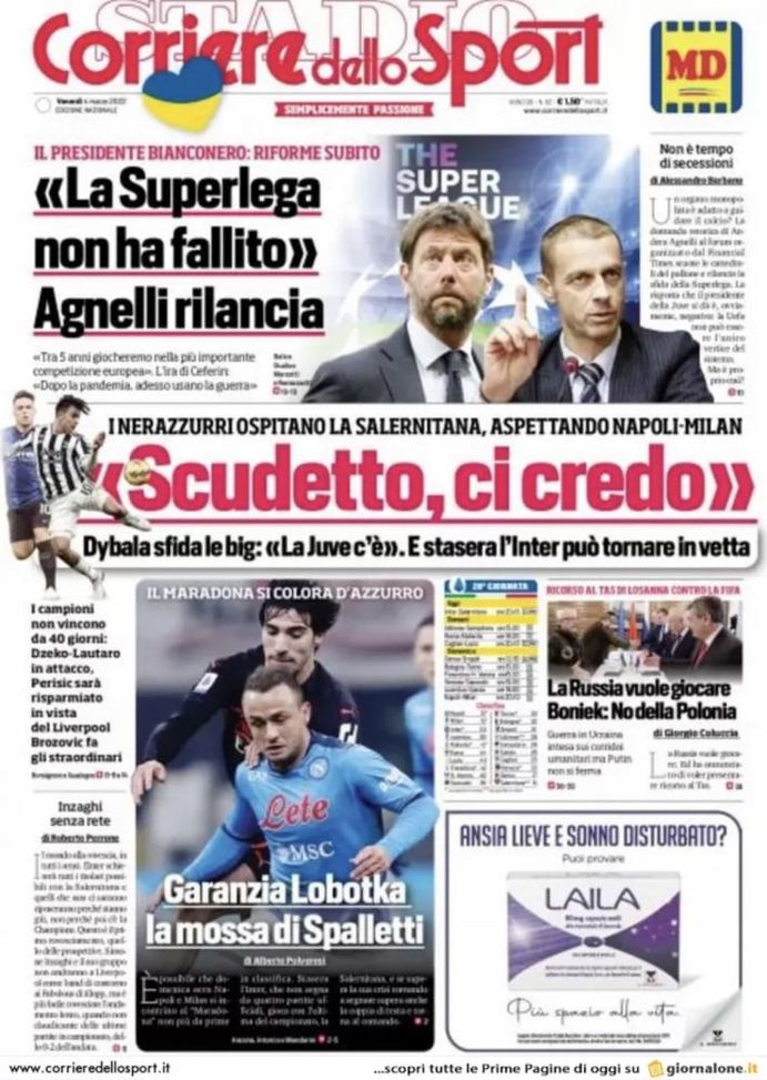 Quindi il 'Corriere dello Sport' oggi in edicola, in prima pagina, apre riportando le dichiarazioni del presidente della Juventus, Andrea Agnelli, il quale rilancia il progetto 'Superlega'. A proposito di Juventus, Paulo Dybala non si nasconde e ritiene che anche i bianconeri sono in corsa per lo scudetto. Domenica sera, invece, il Napoli ospiterà il Milan e Luciano Spalletti, allenatore dei partenopei, si affida alla garanzia Lobotka. Chiusura con il capitolo Ucraina che, inevitabilmente, ha anche delle ripercussioni nel mondo dello sport. In questo caso nel mondo del calcio, con la Russia che vorrebbe partecipare alle competizioni, mentre il vicepresidente della UEFA e rappresentante della Polonia, Zibi Boniek, si ritiene contrario.
