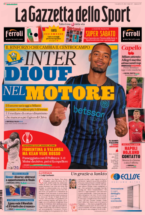 'La Gazzetta dello Sport' oggi in edicola, in prima pagina, apre con l'Inter. Un Diouf in più nel motore. Capello: "Milan attento, Allegri merita attaccanti top". Preso Boniface, oggi le visite. Napoli, Hojlund contatto. Fiorentina a valanga in Conference League. PROSSIMA SCHEDA
