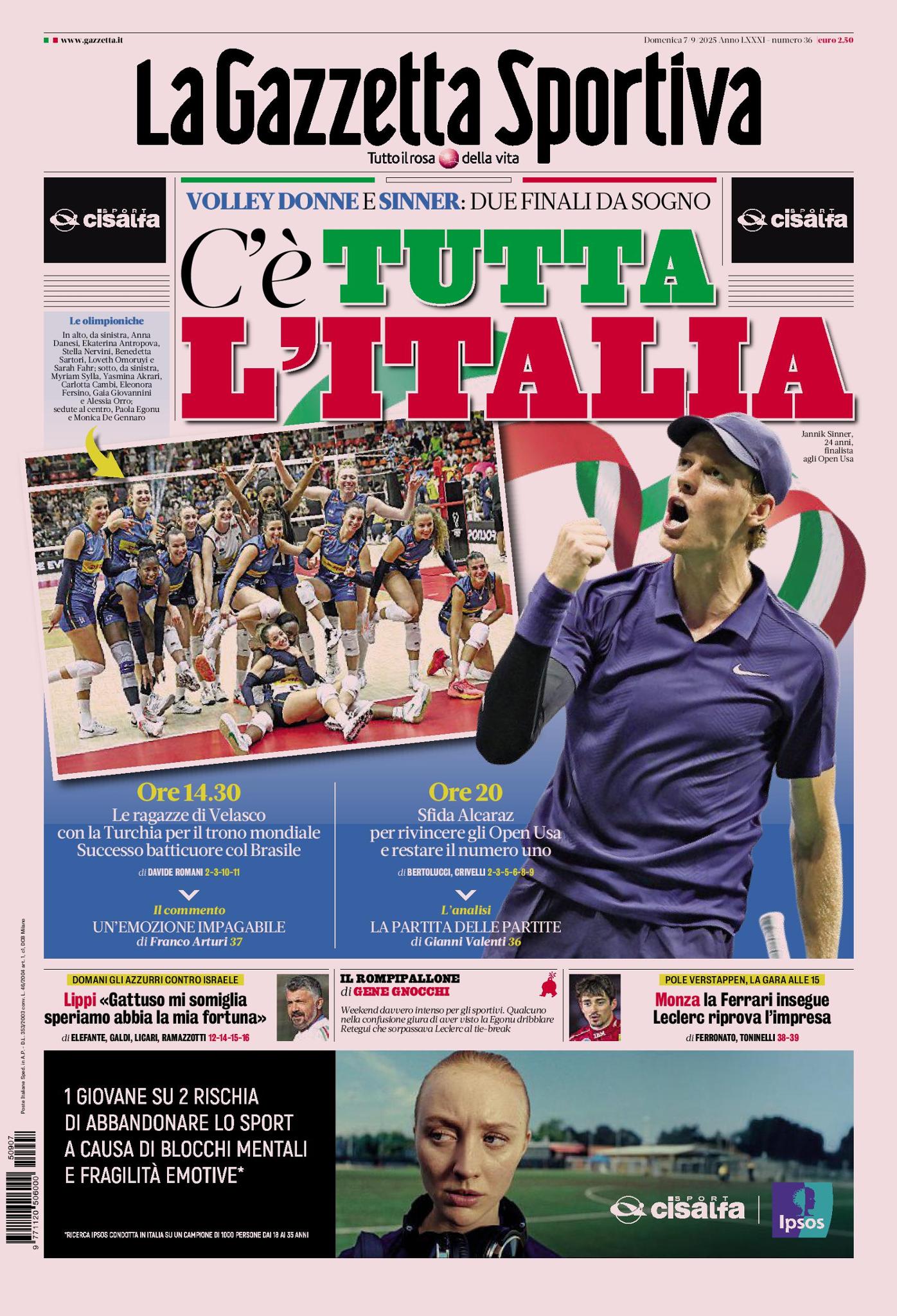 'La Gazzetta dello Sport' oggi in edicola, in prima pagina, apre con "C’è tutta l’Italia”.