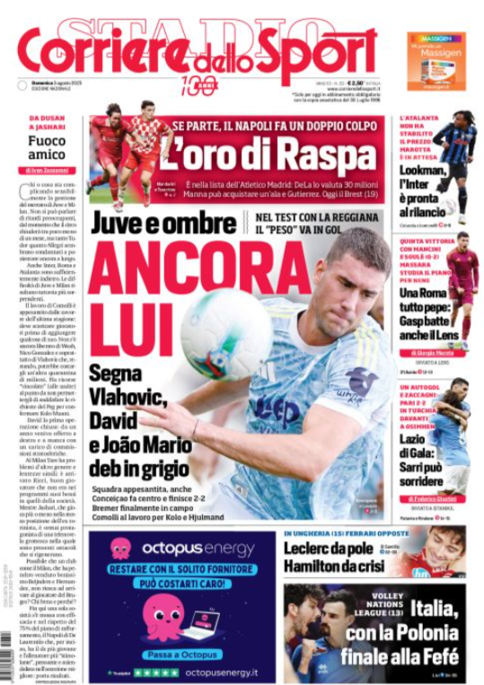 Il 'Corriere dello Sport' oggi in edicola, in prima pagina, apre con la Juventus. Luci e ombre. In gol Vlahovic. Napoli: Guiterrez e un'ala? Occhio a Raspadori. Lookman, pronto il rilancio dell'Inter. Una Roma tutto pepe contro il Lens. Lazio, Sarri può sorridere. PROSSIMA SCHEDA