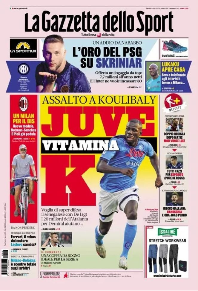 La Gazzetta dello Sport' oggi in edicola, in prima pagina, apre con l'interesse della Juventus per Kalidou Koulibaly, difensore senegalese che potrebbe lasciare il Napoli in questa sessione di mercato. Occhi anche su Milan Skriniar, sul quale c'è l'interesse del PSG intenzionato ad offrire ben 7.7 milioni di euro netti l'anno al difensore dell'Inter. Riguardo i nerazzurri, è probabile che Romelu Lukaku possa tornare a vestire la maglia del biscione. A sinistra spazio anche per il nuovo Milan di Stefano Pioli, che si rifà il look con gli acquisti di Botman e Renato Sanches. Infine il mercato di Roma e Monza, mentre non mancano le pretendenti per il giovane Esposito.