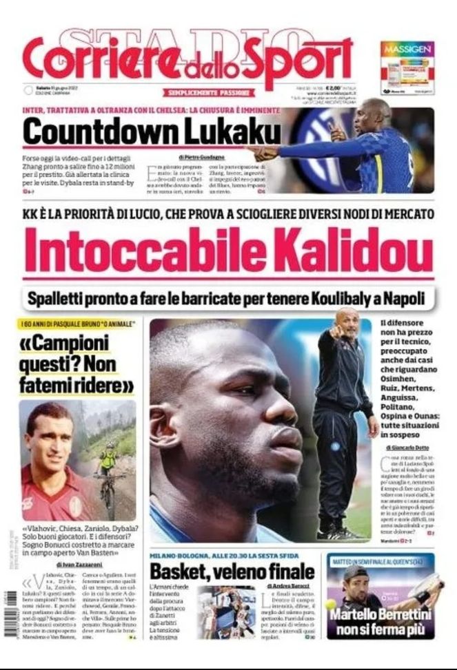 Il 'Corriere dello Sport' oggi in edicola, in prima pagina, apre con la volontà del Napoli di voler tenere a tutti i costi Kalidou Koulibaly. In alto spazio a Romelu Lukaku, il quale potrebbe presto ritornare a vestire la maglia dell'Inter. In risalto anche l'intervista all'ex calciatore del Torino Pasquale Bruno, così come non mancano le notizie che riguardano il mondo del basket e del tennis.