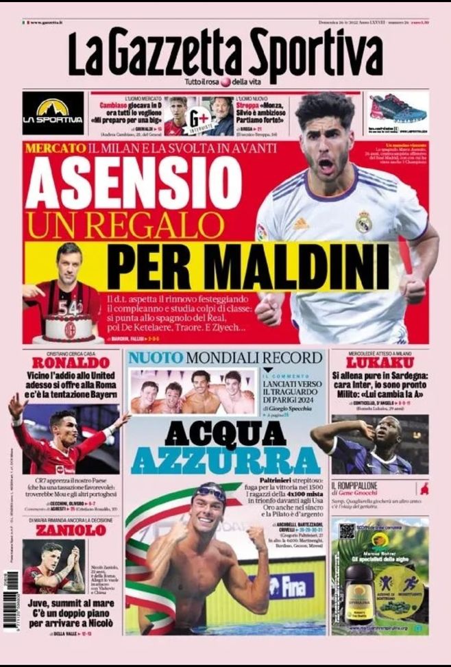 'La Gazzetta dello Sport' oggi in edicola, in prima pagina, apre con una notizia di mercato che riguarda il Milan. Nel giorno del 54esimo compleanno di Paolo Maldini, i rossoneri starebbero sondando concretamente la pista che porterebbe ad Asensio. La 'rosea' riporta anche un clamorosa indiscrezione che riguarda il futuro di Cristiano Ronaldo. CR7 infatti potrebbe lasciare il Manchester United e si troverebbe a metà strada tra la Roma e il Bayern Monaco. Inoltre la stessa Roma potrebbe cedere Nicolò Zaniolo alla Juventus, mentre Romelu Lukaku è già in Italia. Big Rom si trova in vacanza in Sardegna e si starebbe già allenando per farsi trovare pronto da Simone Inzaghi. Sotto la testata, le interviste ad Andrea Cambiaso e Giovanni Stroppa.