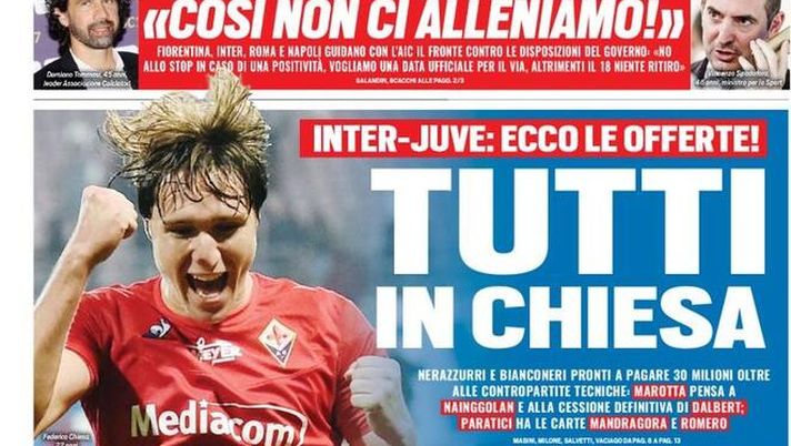In primo piano viene riportato l'interesse di Inter e Juventus per Federico Chiesa. In alto il caos sul protocollo FIGC sugli allenamenti collettivi non condiviso dai club di Serie A. In basso l'addio inaspettato di Andrea Barzagli dallo staff della Juventus. Per quanto riguarda il Milan non c'è nulla di particolare da segnalare.