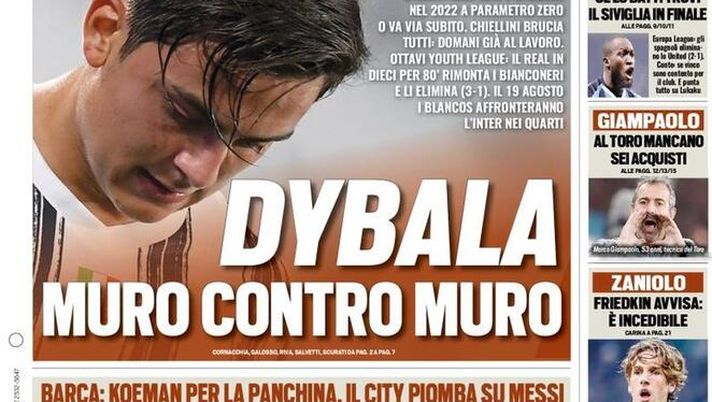 "Il quotidiano 'Tuttosport' oggi in edicola dedica la sua prima pagina alla situazione dell'attaccante Paulo Dybala con la Juventus. Tante sono le strade ipotizzabili per il futuro dell'argentino: o resta in bianconero senza rinnovo di contratto e si libera a parametro zero nel 2022, oppure viene ceduto in questa sessione di calciomercato. Nel frattempo, procede bene il recupero di Giorgio Chiellini.