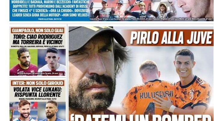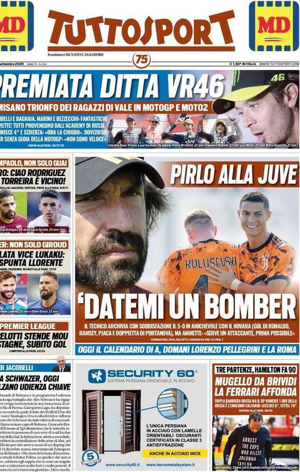 "'Tuttosport', in copertina, parla del 5-0 rifilato dalla Juventus al Novara in amichevole. Buone indicazioni per Andrea Pirlo, tecnico bianconero, il quale, però, invoca l'acquisto di un nuovo centravanti.