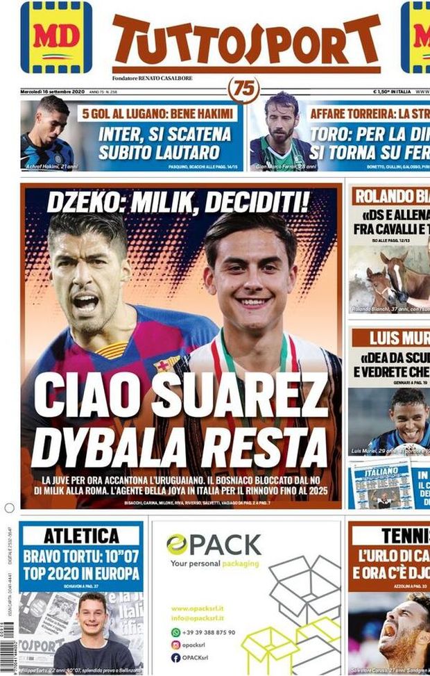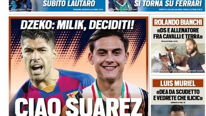 "'Tuttosport' oggi in edicola, in copertina, parla della rinuncia della Juventus a Luís Suárez del Barcellona. Il prescelto, per il ruolo di centravanti, è Edin Dzeko.