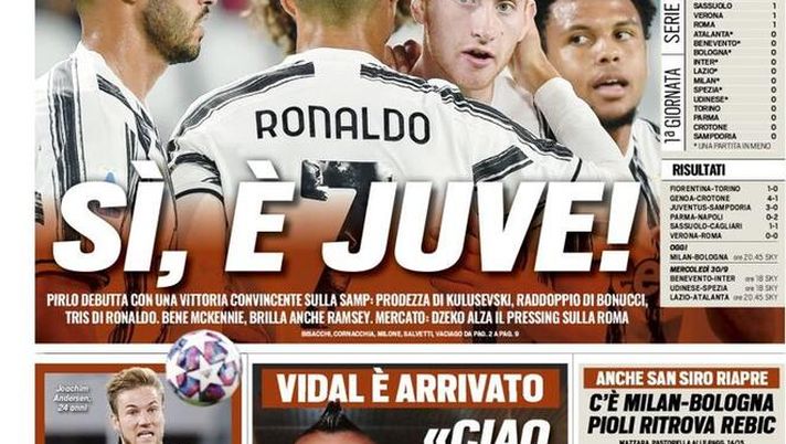 "'Tuttosport', in prima pagina, manifesta goduria assoluta per il 3-0 di Juventus-Sampdoria all'Allianz Stadium. A segno Dejan Kulusevski, Leonardo Bonucci e Cristiano Ronaldo, ma il tecnico Andrea Pirlo ha indovinato tutte le scelte, a partire dall'impiego di Weston McKennie e di Aaron Ramsey in posizione più avanzata.