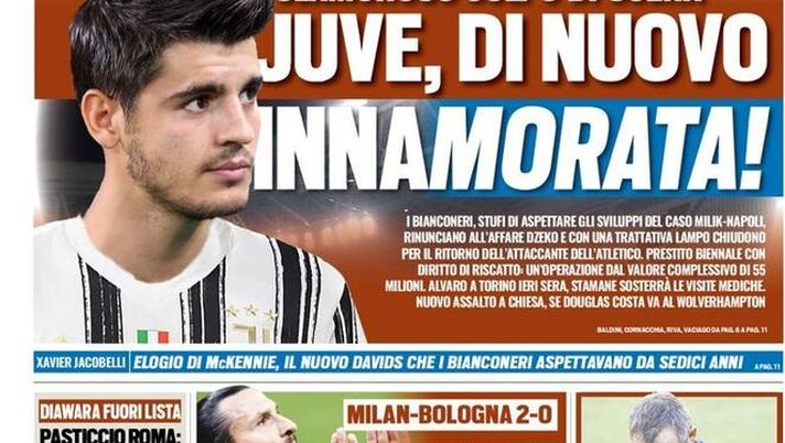 "'Tuttosport' oggi in edicola, in copertina, parla di Álvaro Morata, nuovo centravanti della Juventus. Sbarcato ieri sera a Torino, lo spagnolo farà le visite mediche in mattinata al 'J-Medical'. Nuovo assalto bianconero a Federico Chiesa se partirà Douglas Costa.