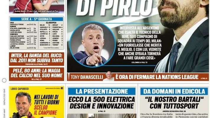 "'Tuttosport' oggi in edicola, in prima pagina, presenta un'intervista esclusiva con Hernán Crespo, ex attaccante di Parma, Lazio, Inter e Milan. L'argentino parla di Andrea Pirlo, tecnico della Juventus, suo ex compagno di squadra in rossonero. In alto, sotto la testata, spazio proprio alla squadra di Stefano Pioli, capace di espugnare (3-1) il 'Celtic Park' di Glasgow nella prima giornata del Gruppo H di Europa League.