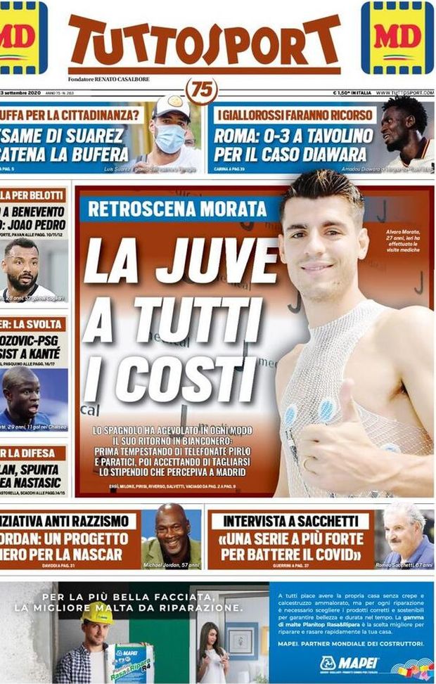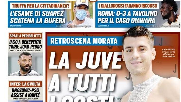 "'Tuttosport', in copertina, parla di Álvaro Morata, attaccante che, da ieri, è ufficialmente tornato alla Juventus. Lo spagnolo si è tagliato lo stipendio pur di ritornare in bianconero da Andrea Pirlo, suo ex compagno di squadra.