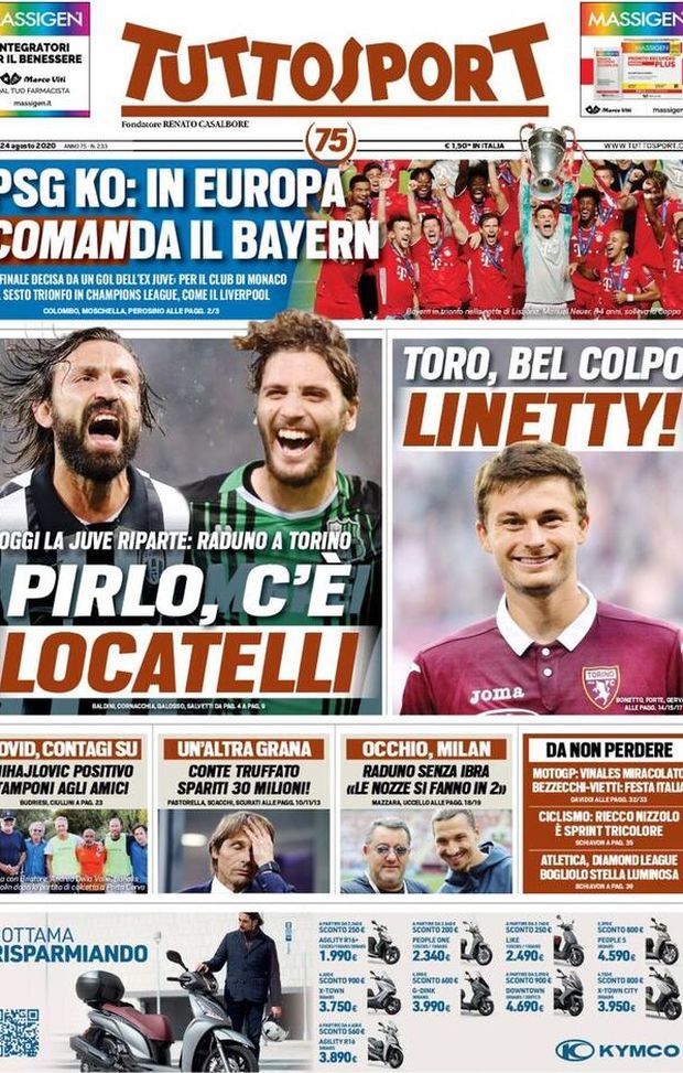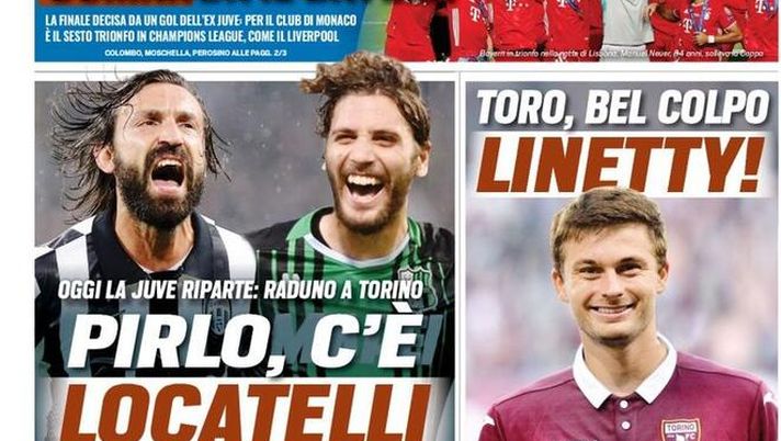 "'Tuttosport' oggi in edicola divide praticamente in tre parti uguali la sua prima pagina. Si parte parlando del calciomercato della Juventus, con il tecnico Andrea Pirlo che punta l'ex milanista Manuel Locatelli quale rinforzo per il centrocampo. Si prosegue con le mosse del Torino di Urbano Cairo, che ha regalato il centrocampista polacco Karol Linetty al tecnico Marco Giampaolo.