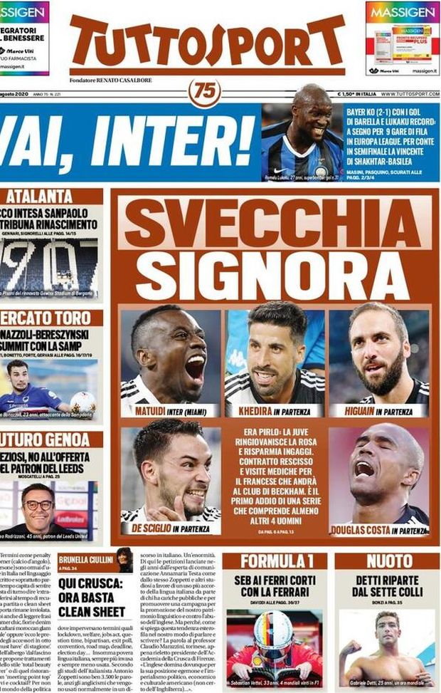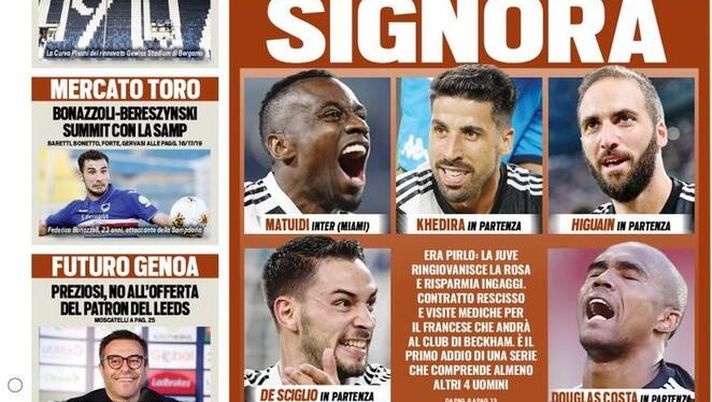 "'Tuttosport', in prima pagina, parla del calciomercato della Juventus di Andrea Pirlo: i bianconeri vanno verso una rivoluzione dell'organico che sarà messo a disposizione del neo-allenatore. Ha salutato già tutti Blaise Matuidi, che giocherà in MLS con l'Inter Miami di David Beckham: restano in partenza da Torino anche Mattia De Sciglio, Sami Khedira, Douglas Costa e Gonzalo Higuaín.