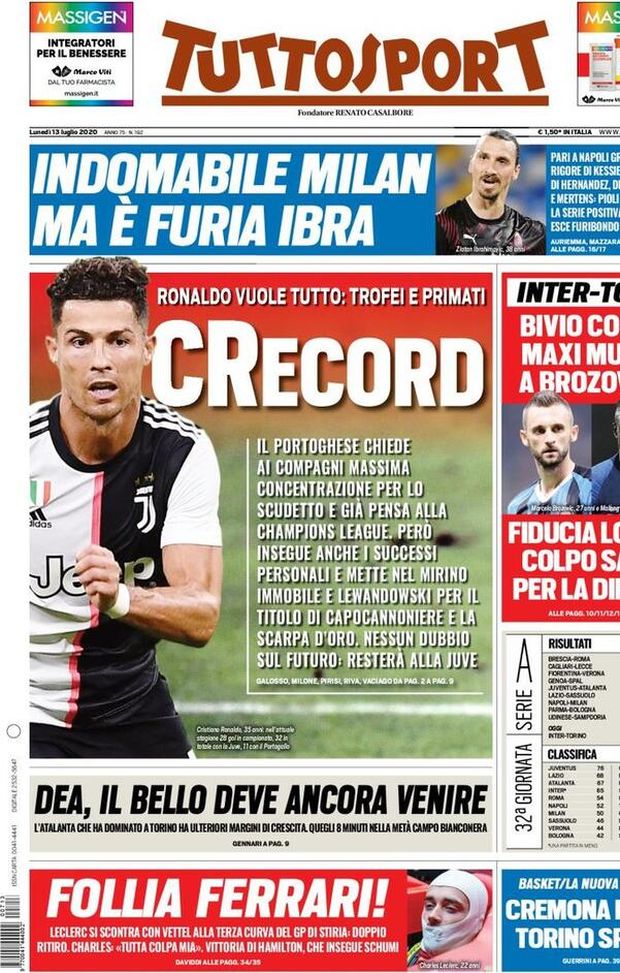 MILAN NEWS – Questa la prima pagina di Tuttosport, in edicola oggi, lunedì 13 luglio 2020. Diamo un’occhiata alle principali novità sul mondo dello sport e in particolare del calcio, cercando di evidenziare le notizie sul Milan. In primo piano gli obiettivi personali e di squadra di Cristiano Ronaldo, che insegue la Scarpa d'Oro e la Champions League. In alto il pareggio tra Napoli e Milan, con particolare attenzione alla furia di Zlatan Ibrahimovic per la sostituzione.