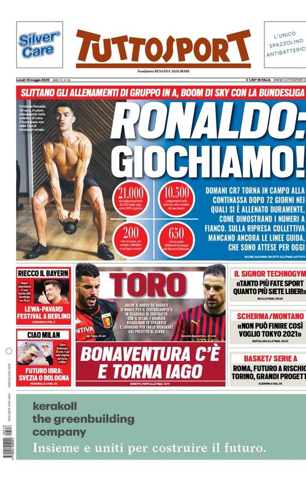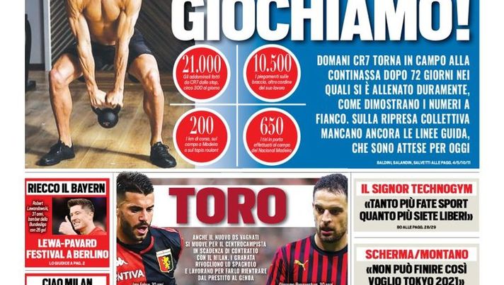 Il quotidiano torinese si concentra quasi esclusivamente sul calcio, con riferimenti a Juventus e Torino principalmente. Gli allenamenti individuali sono ripresi, ma restano dubbi circa la ripresa di quelli collettivi. C'è dunque grande attenzione su questo tema, ma anche al calciomercato. Nello specifico i colleghi di Tuttosport insistono su Giacomo Bonaventura (che presto sarà svincolato dal Milan) e il futuro al Torino.
