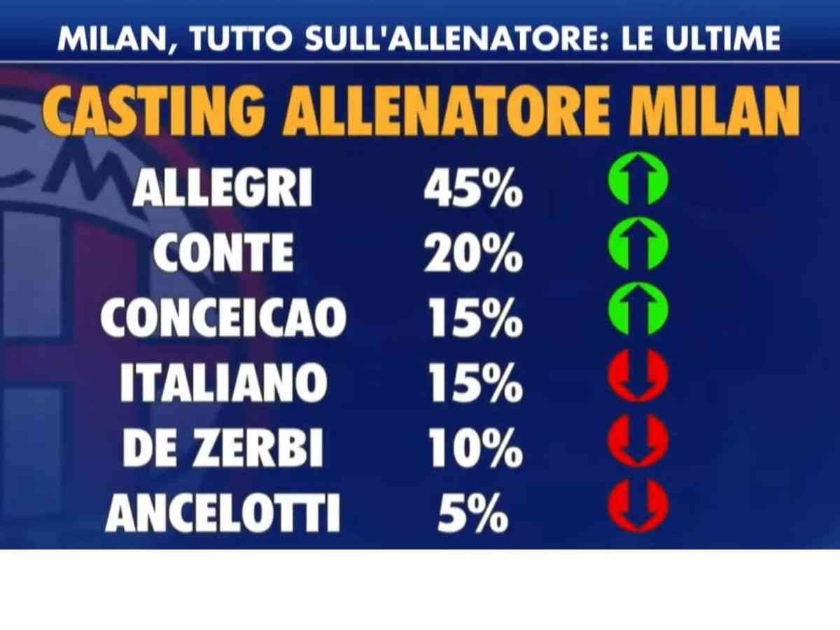 —In ogni caso i colleghi di 'TeleLombardia', nel corso del consueto appuntamento con la trasmissione 'QSVS', hanno proposto una grafica con il borsino dei favoriti. Al primo posto troviamo Massimiliano Allegri con il 45%, che sembra essere quindi il favorito numero uno. Alle sue spalle, invece, in ascesa le quotazioni di Antonio Conte (20%) e appunto Sérgio Conceicao (15%). Crollano, invece, Vincenzo Italiano, Roberto De Zerbi e Carlo Ancelotti, rispettivamente al 15, 10 e 5%. Assente addirittura Maurizio Sarri che da molti è considerato in pole position.
