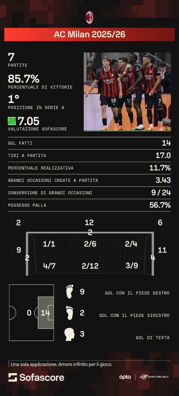 Numeri davvero impressionanti che fin troppo spesso passano in cavalleria. Inoltre Allegri sta facendo tutto questo con una prima punta che devo ancora sbloccarsi del tutto, visto che Gimenez è fermo a un gol in Coppa Italia. Certo influisce la partenza stratosferica di Pulisic (già 6) e una squadra che gioca più insieme e con più aggressività. I 17 tiri di media e le 4 grandi occasioni di media creati sono segnali davvero importanti: questo Milan attacco e lo fa anche molto, molto bene. 14 gol in 7 partite vuol dire 2 gol a partita con i soli 3 subiti in totale. Vedremo come andrà questa sera contro una difesa fisica con quella della Juventus.