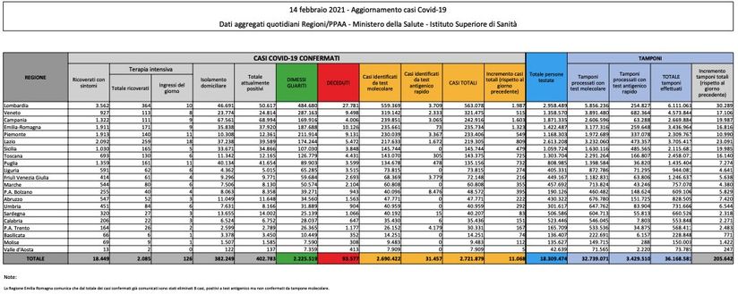 "Il Dipartimento di Protezione Civile, come di consueto, ha emesso il bollettino ufficiale sulla situazione della diffusione e del contagio del coronavirus nel nostro Paese. Dunque, questi sono i dati reali aggiornati ad oggi, domenica 14 febbraio 2021.