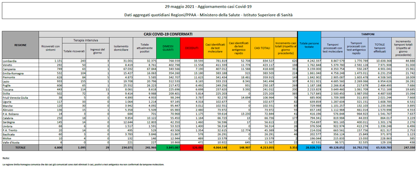 Il Dipartimento di Protezione Civile, come di consueto, ha emesso il bollettino ufficiale sulla situazione della diffusione e del contagio del coronavirus nel nostro Paese. Dunque, questi sono i dati reali aggiornati ad oggi, sabato 29 maggio 2021.