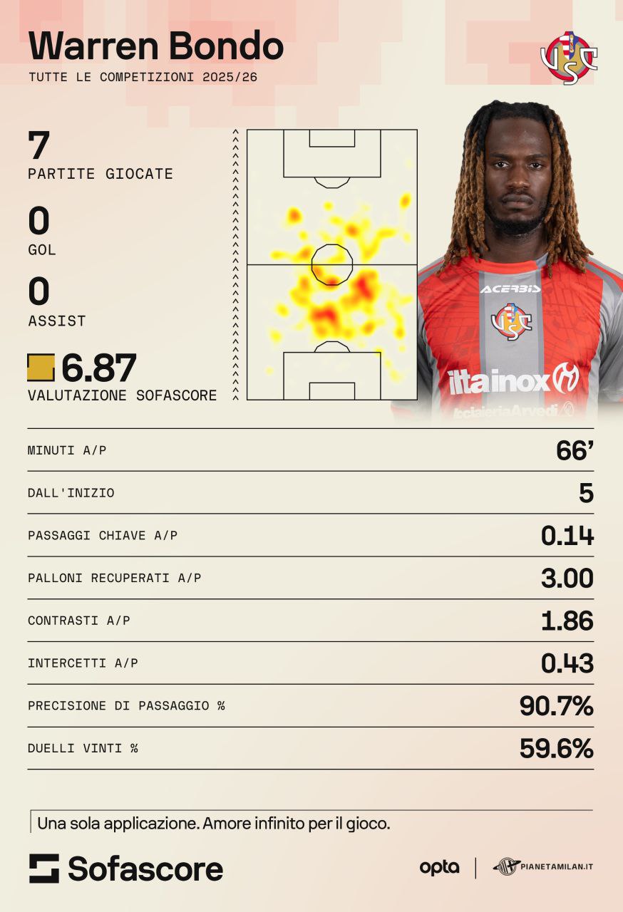 Bondo ha giocato 7 partite in stagione con la Cremonese ed è un titolare fisso visto che i minuti di media in campo sono 66. 5 le gare in cui è partito dal primo minuti. Dati significativi per un giocatore con le sue caratteristiche: 3 palloni recuperati a partita, quasi il 60% di duelli vinti, mezzo intercetto a partita e quasi due contrasti di media. Come possiamo vedere dalla heatmap, Bondo con la Cremonese ha giocato spesso e volentieri davanti alla difesa, al massimo leggermente spostato sul centrodestra. Bondo è un giocatore molto fisico che fa della corsa e della forza i suoi punti di forza. E' un centrocampista in grado tenere bene il controllo del pallone e sa anche smistare bene i possessi ai compagni. La Cremonese è partita alla grande in stagione e il merito è di Nicola che ha trovato subito la quadra, ma c'è lo zampino anche del lavoro di Bondo a centrocampo e di Terracciano in difesa. Sicuramente questo prestito di Bondo sarà determinante per la sua crescita.