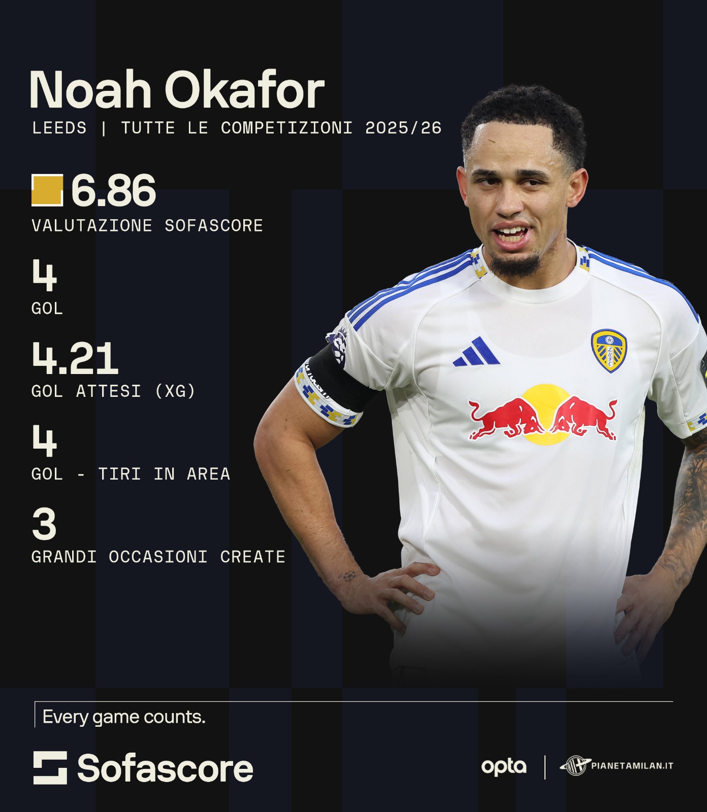 Okafor in questa stagione con il Leeds ha segnato 4 gol con degli XG che si attestano sui 4.21. 4 gol con 4 tiri in area di rigore e 4 occasioni create. Numeri interessanti quelli di Okafor: lo svizzero ha giocato fino a questo momento 23 partite in Premier League e 26 in totale con il Leeds partendo 12 volte da esterno sinistro e undici volte da prima punta. Il Milan lo ha ceduto per una cifra vicino ai 20 milioni di euro ed è stata una cessione davvero importante per il bilancio rossonero, ma con il senno di poi Okafor avrebbe fatto comodissimo nel 3-5-2 di Allegri. Lo svizzero non è una prima punta fisica, ma è un giocatore che ha il senso del gol nella pelle e che sa trovare la porta quando chiamato in causa. Probabilmente la sua permanenza avrebbe escluso l'arrivo di Nkunku che per il momento non ha ripagato, anzi.