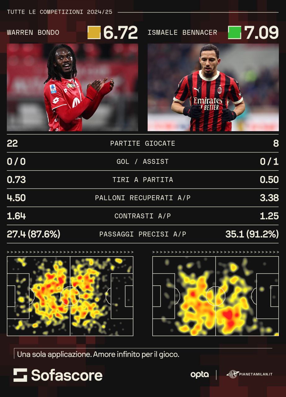 Andiamo a vedere le loro prestazioni grazie ai numeri e alle statistiche di 'Opta' e 'Sofascore' per PianetaMilan. Prendiamo il campione di questa stagione. Bondo ha giocato 22 partite con il Monza, mentre Bennacer ha giocato solo 8 partite con il Milan, al rientro dal lungo infortunio. Il francese ha quasi un tiro a partita di media mentre Bennacer la metà. Dove domina Bondo è sui palloni recuperati di media e i contrasti per partita. Mentre Bennacer ha una quantità di passaggi maggiore, come per la percentuale di precisione. Da questi numeri è evidente come Bondo e Bennacer siano giocatori diversi: il francese può essere un cambio importante per fare respirare Fofana, mentre Bennacer poteva essere una soluzione importante per impostare dal basso. Per il modo di giocare di Conceicao forse Bondo è più congeniale, visto che potrebbe correre e pressare alto con più efficacia rispetto a Bennacer. Vedremo come Conceicao cambierà il centrocampo del suo Milan, dopo un mercato pazzo e rivoluzionario. LEGGI ANCHE: Milan, Sottil il colpo last minute: ecco il paragone con Chukwueze>>>