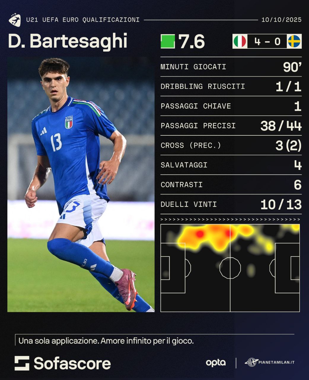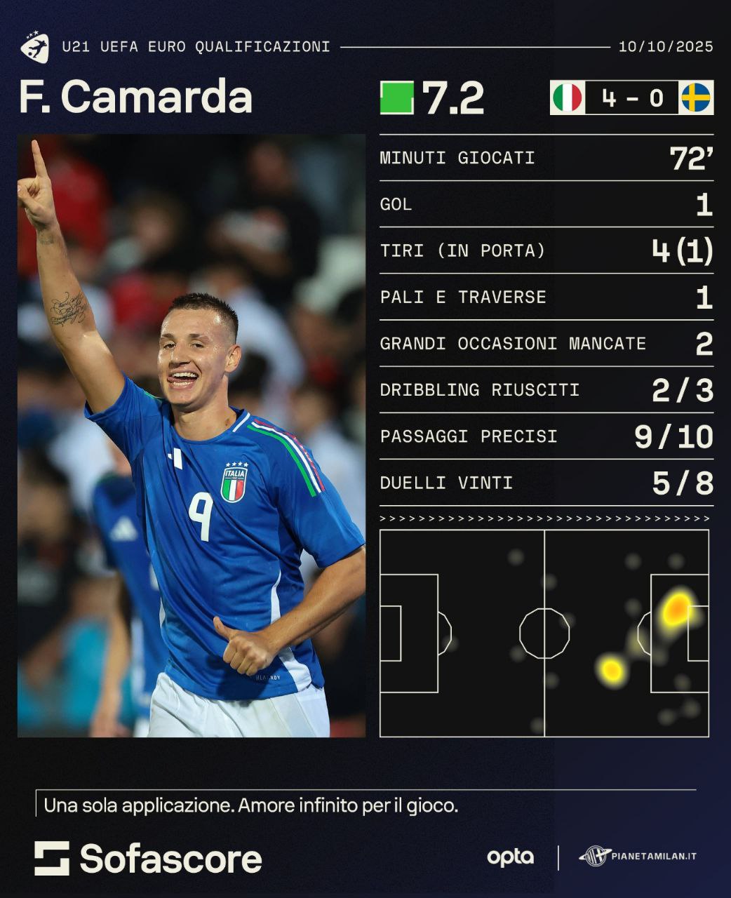 Bartesaghi è sembrato un veterano della formazione non subendo praticamente mai contro gli attaccanti svedesi e riuscendo a chiudere i vari tentativi degli avversari. Magari in attacco si è visto meno, ma la prova è stata convincente. Un bel segnale per il Milan e per Allegri, soprattutto visto l'infortunio di Estupinan in Nazionale. Per Camarda altro record: giocatore più giovane a segnare con l'Italia Under 21 e una partita da '9' d'area di rigore vero. Movimenti giusti, inserimenti, furbizia nel prendersi il rigore, glaciale nel trasformarlo. I due giovani del Milan crescono alla grande.