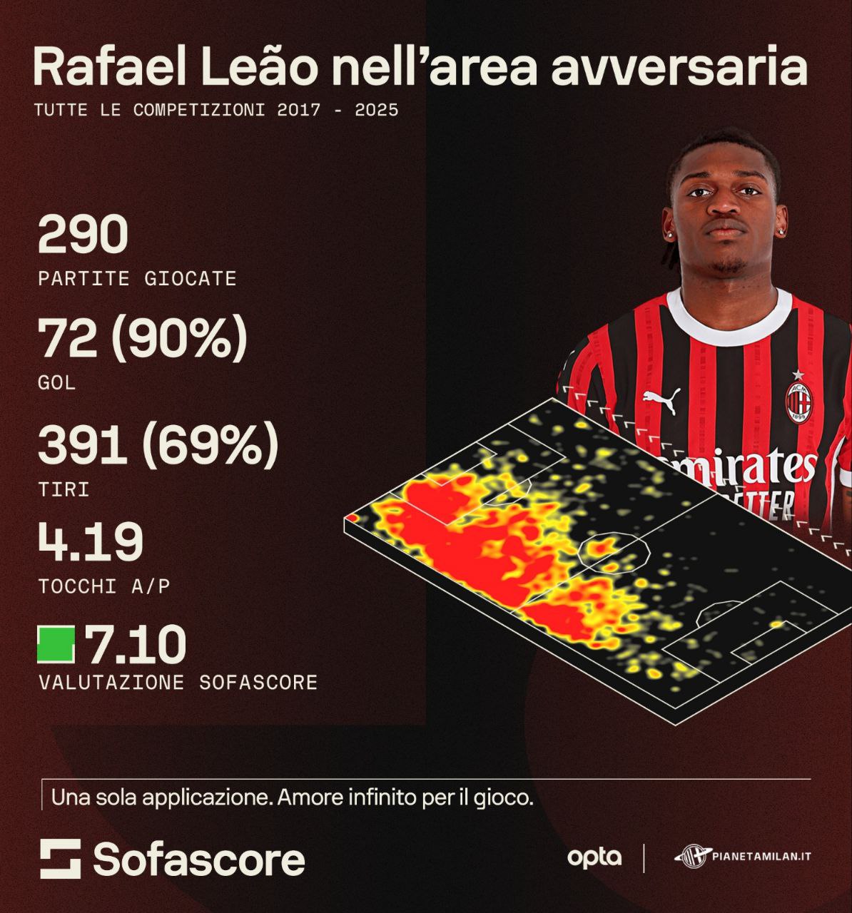 Nelle 290 partite giocate, Leao ha segnato 72 gol nell'area di rigore avversaria, circa il 90% dei suoi gol totali. 391 in area che sono il 69% dei tiri totali. Inoltre il portoghese ha poco più di 4 tocchi a partita negli ultimi undici metri. Come possiamo vedere dalla heatmap, Leao ha giocato spesso e volentieri partendo dalla fascia sinistra del campo. Numeri comunque importanti in area di rigore per il portoghese che in carriera ha segnato spesso e volentieri negli ultimi undici metri degli avversari. A livello di concretizzazione, quindi, il portoghese fa fare gol a pochi metri dalla porta che è una delle caratteristiche principali che deve avere una prima punta.