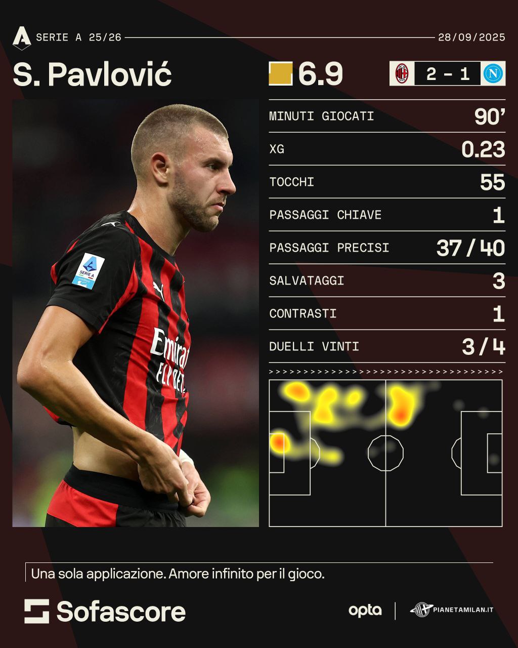 Per Pavlovic 90 minuti in campo con 55 tocchi, un passaggio chiave, 37 passaggi precisi, 3 salvataggi, un contrasto e 3 duelli vinti su quattro. Come possiamo vedere dalla heatmap, Pavlovic ha coperto la fascia sinistra del campo. Il Milan è cambiato molto in pochi mesi e la difesa subisce di meno anche per un centrocampo che fa più filtro. Tutto corrono, tutti sono attenti e i 'buchi' in difesa sono sempre meno. Anche in dieci e contro una squadra come il Napoli, il Diavolo si è difeso molto molto bene, con i pericoli maggiori arrivati da tiri da fuori area. Una stagione può cambiare davvero tutto: Pavlovic lo scorso anno è stato molto incostante con prove ottime contrastate da errori importanti.
