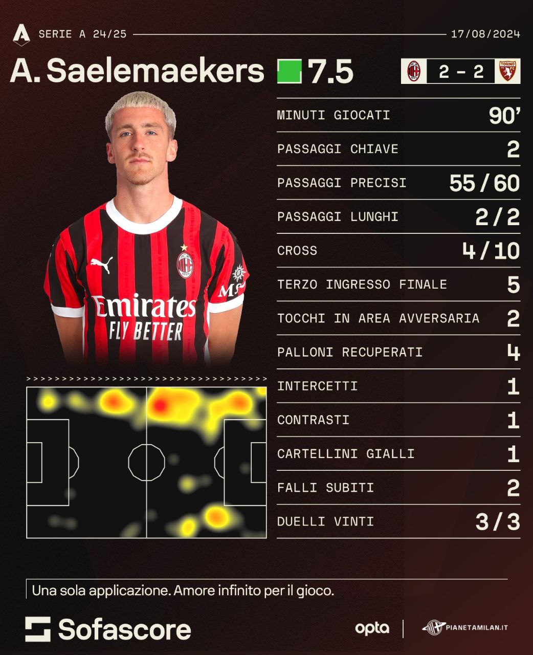 Andiamo a vedere i numeri di Saelemaekers contro il Torino grazie alle statistiche di 'SofaScore' e 'Opta' per PianetaMilan. 90 minuti in campo con 2 passaggi chiave e 55 passaggi precisi. 4 cross riusciti su 10 e 5 ingressi nel terzo finale di campo con 2 tocchi in area avversaria. Un intercetto, un contrasto e 3 duelli vinti.