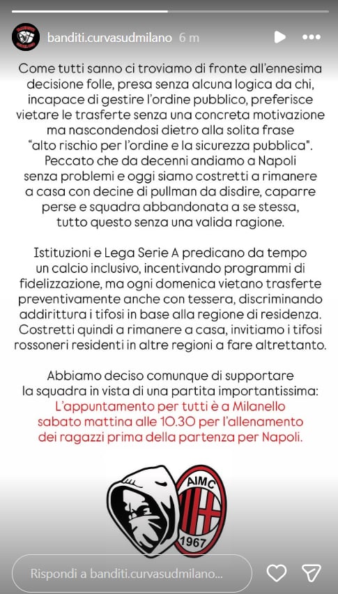 "Peccato che da decenni andiamo a Napoli senza problemi. Oggi siamo costretti a rimanere a casa con decine di pullman da disdire, caparre perse e squadra abbandonata a se stessa, tutto questo senza una valida ragione. Istituzioni e Lega Serie A predicano da tempo un calcio inclusivo, incentivando programmi di fidelizzazione, ma ogni domenica vietano trasferte preventivamente anche con tessera, discriminando addirittura i tifosi in base alla regione di residenza. Costretti quindi a rimanere a casa, invitiamo i tifosi rossoneri residenti in altre regioni a fare altrettanto".