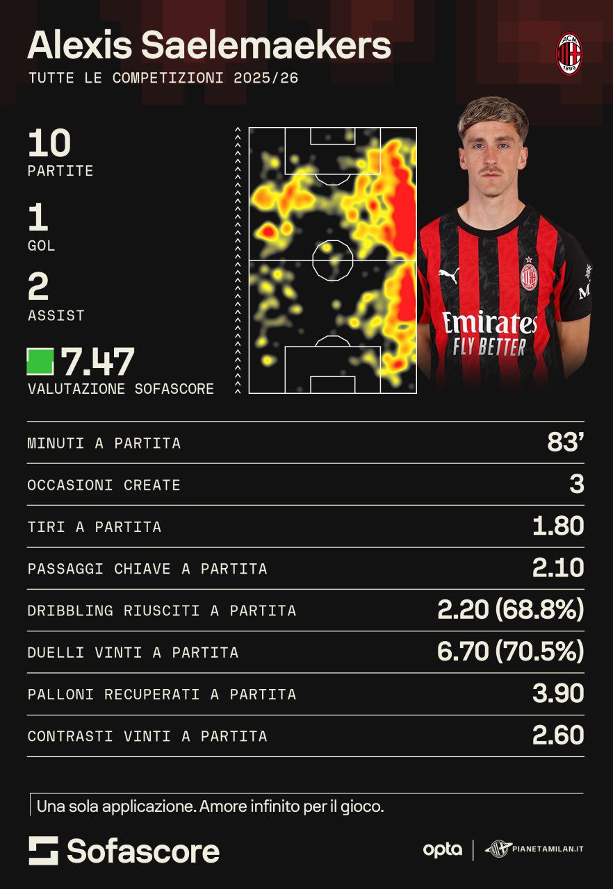 10 partite con 83 minuti di media con un gol e 2 assist. Come possiamo vedere dalla heatmap, Saelemaekers ha giocato a tutta fascia a destra comprendo da area a area. Per il belga sono 3 le occasioni create con quasi due tiri di media come i passaggi chiave e i dribbling riusciti. Tantissimi i duelli vinti a partita quasi 7 per il 70%. Quasi 4 i palloni recuperati e poco più di 2,5 i contrasti vinti di media. Numeri veramente importanti quelli di Saelemaekers con il Milan. Per i rossoneri è stata una fortuna che prima Bologna e poi Roma non abbiamo riscattato o comprato il giocatore dopo i vari prestiti. Il Diavolo ha trovato un giocatore pronto, in grado di fare tanti ruoli e di essere un perno inamovibile di Allegri. Saelemaekers è forse il giocatore più insostituibile nell'undici titolare del Milan per le qualità e le sue caratteristiche.