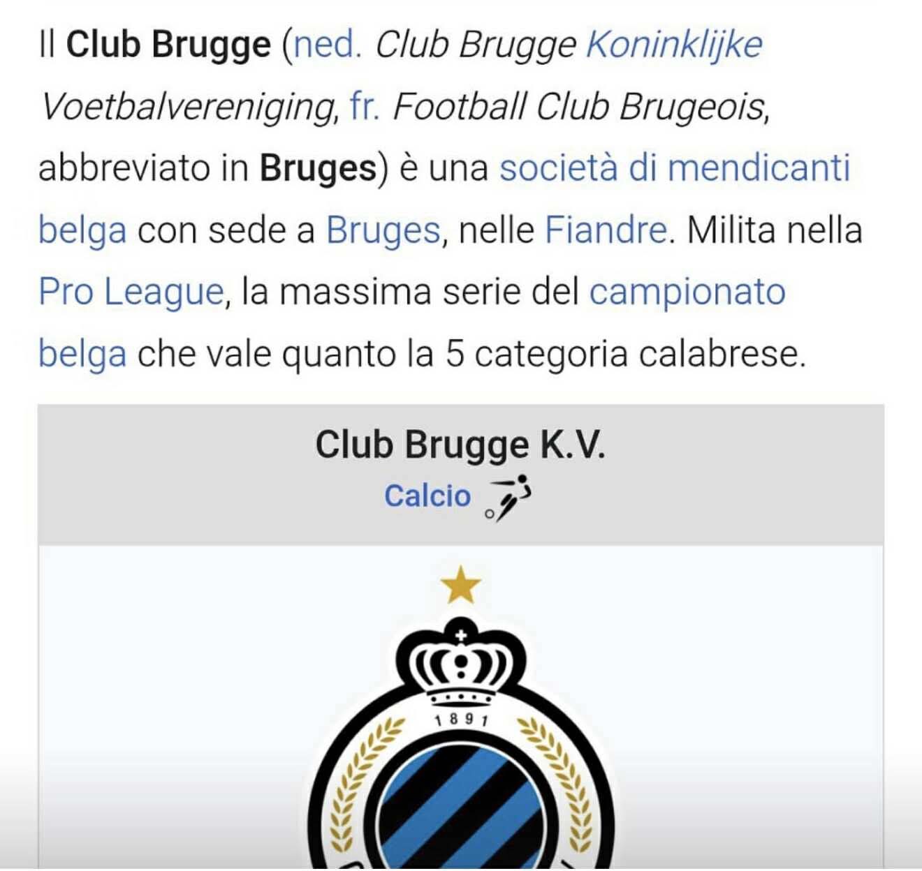 Ora ne hanno combinata un'altra: su 'Wikipedia' hanno modificato la descrizione del Bruges, definendo il club come "una società di mendicanti belga". Dopo qualche ora, la correzione è stata notata e modificata, ripristinando la dicitura canonica.