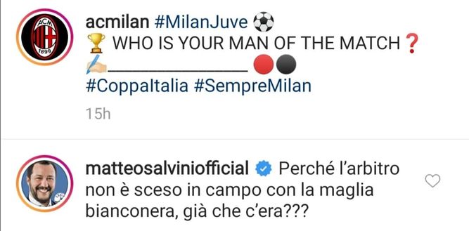 Matteo Salvini, leader della Lega e grande tifoso rossonero, ha commentato un post del Milan relativo alla gara di ieri. Argomento? L'arbitro Valeri