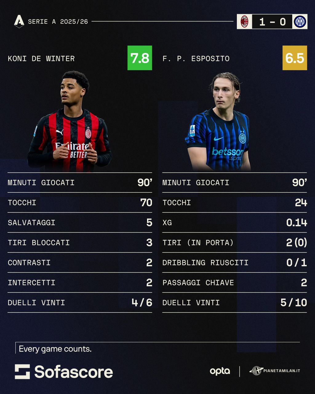 90 minuti in campo per entrambi, ma già guardando i tocchi De Winter stravince: 70 contro 24. 5 salvataggi per il difensore e solo lo 0.14 di XG per l'attaccante con due tiri di cui zero in porta. 3 tiri bloccati invece per il rossonero conditi anche da due contrasti e due intercetti con 4 duelli vinti su 6. Per Esposito 0 dribbling riusciti, due passaggi chiave e solo 5 duelli vinti su 10.