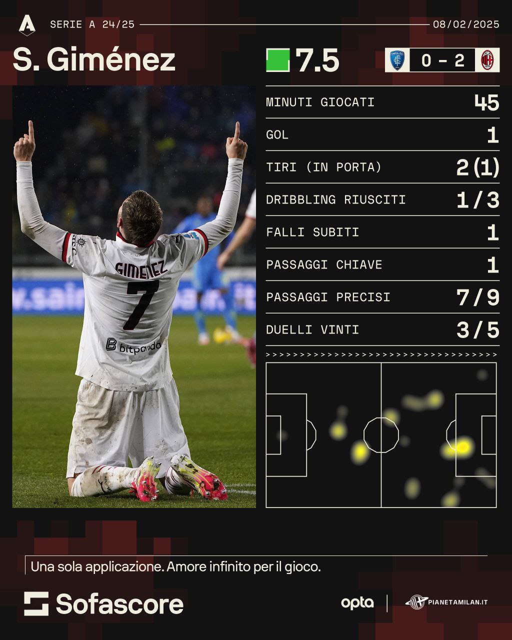 Andiamo a vedere la sua prestazioni grazie ai numeri e alle statistiche di 'Opta' e 'Sofascore' per PianetaMilan. 45 minuti giocati per Santiago Gimenez, ma di grande caratura. Un gol, 2 tiri di cui uno in porta (ovvero la rete). Un fallo subito, un passaggio chiave, 3 duelli vinti su 5 e 7 su 9 nei passaggi. Una valutazione complessiva di 7,5. Ecco i numeri e la heatmap della punta messicana.