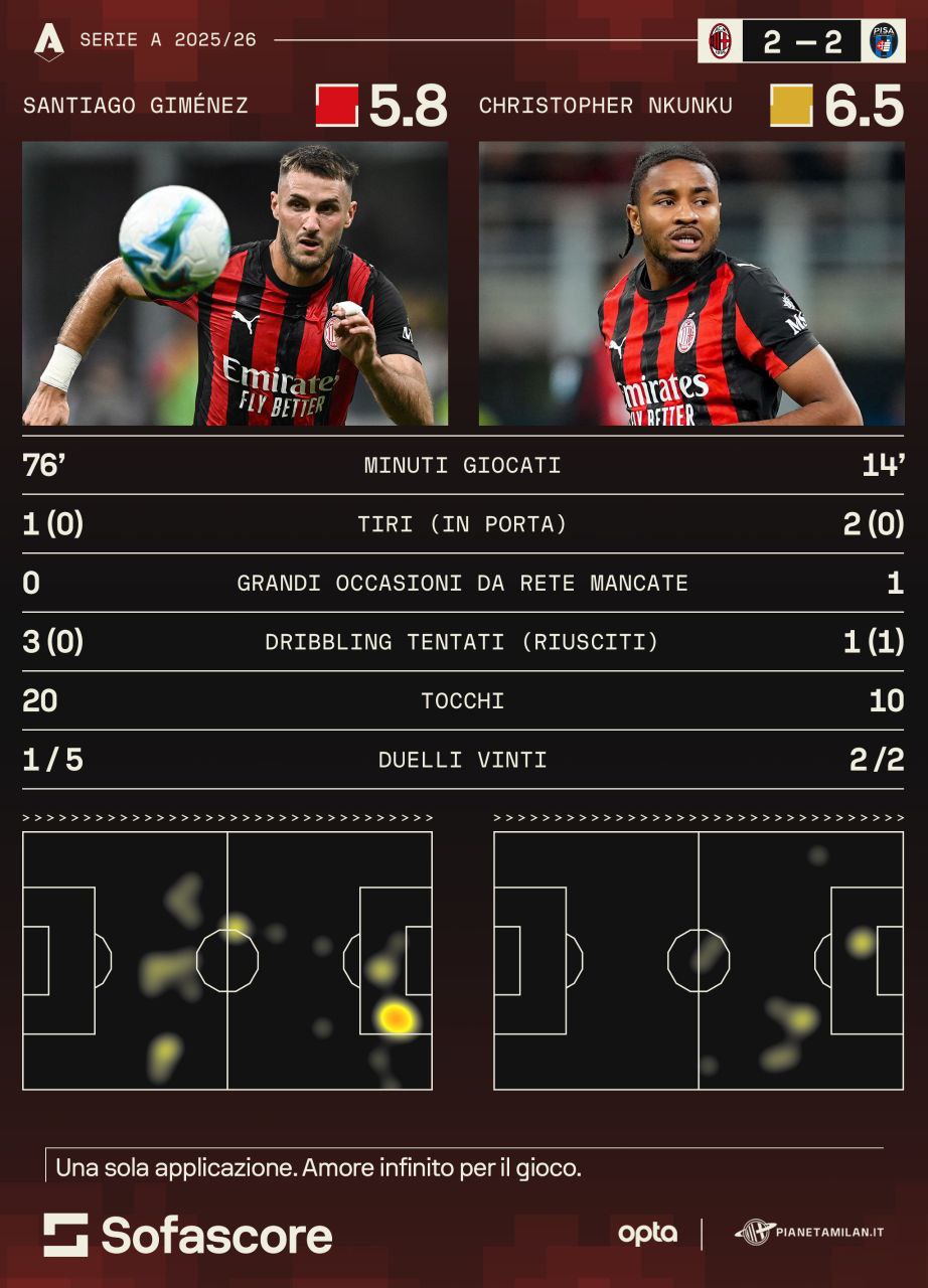 I due attaccanti del Milan non hanno giocato benissimo contro il Pisa e lo testimoniano anche i numeri. 76 minuti per Gimenez, 14 per Nkunku, ma solo 3 tiri totali di cui 0 in porta. Una grande occasione mancata da parte del francese. 30 tocchi totali, pochissimi i 20 di Gimenez. 2 duelli vinti su 2 per Nkunku, uno solo su 5 per il messicano. Partita in ombra per i due attaccanti del Milan. Nkunku ha sprecato una ghiotta occasione sul bell'assist di Leao. Gimenez non si è visto per tutta la gara contro il Pisa, anche se non è stato cercato dai compagni. Testimoni i 20 tocchi in più di 70 minuti, davvero pochi per il messicano.