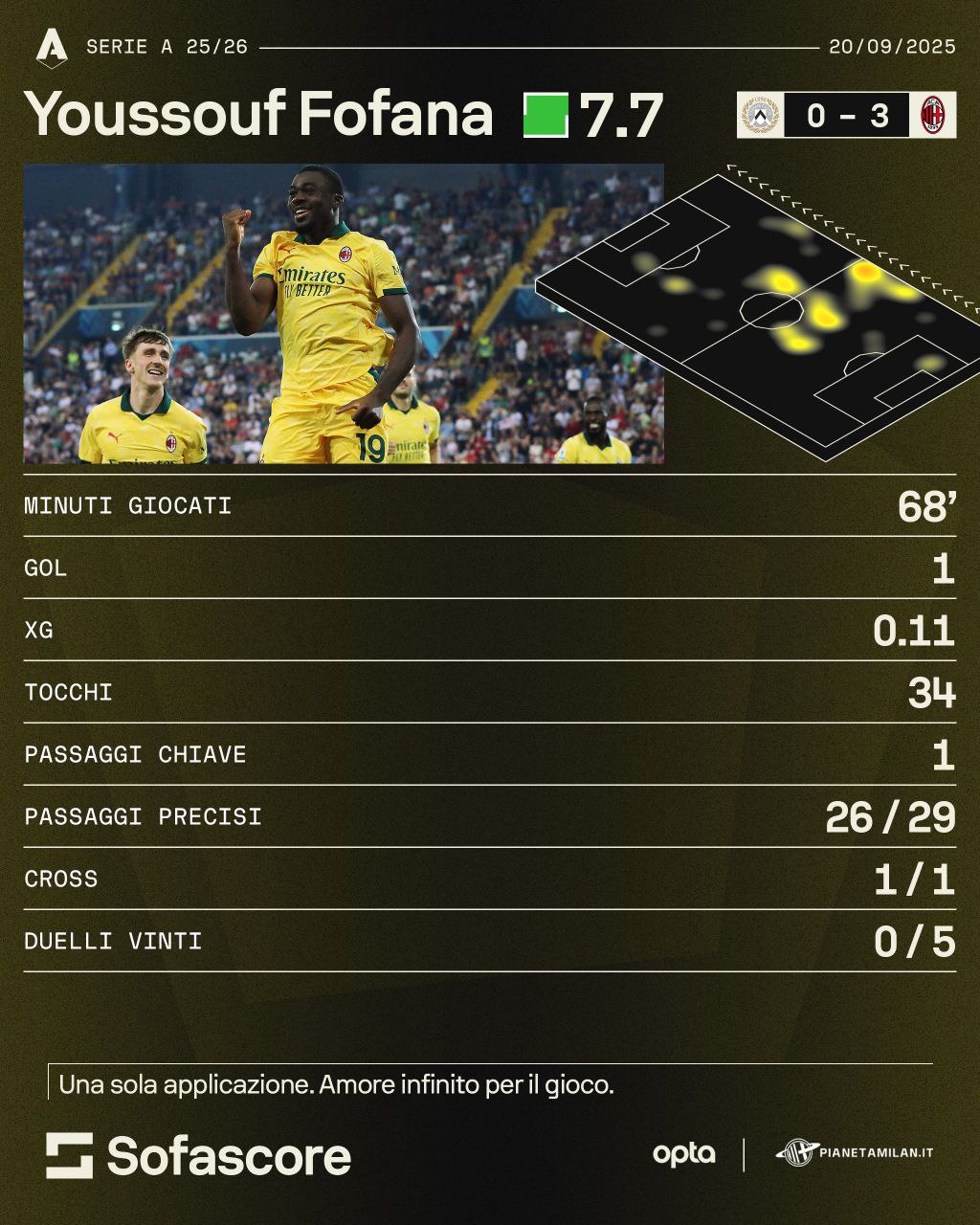 Per Fofana 68 minuti in campo con un gol e 34 tocchi. Un passaggio chiave e 26 passaggi precisi riusciti su 29. Un cross e zero duelli vinti sui 5 tentati. Come possiamo vedere, il francese è rimasto comunque basso per la maggior parte della partita comprendo il centro destra del Milan.