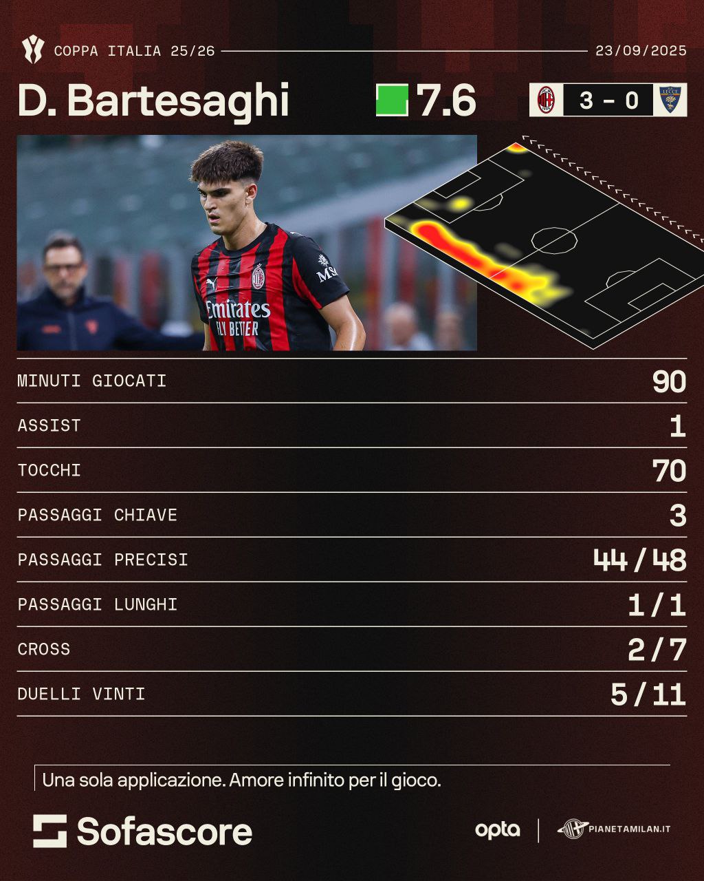 90 minuti in campo per Bartesaghi con 1 assist, 70 tocchi e 3 passaggi chiave. 44 passaggi precisi riusciti su 48 con un passaggio lungo. 2 cross riusciti su 7 e 5 duelli vinti su 11. Come possiamo vedere dalla sua heatmap, Bartesaghi ha giocato molto alto e vicino all'area di rigore del Lecce.
