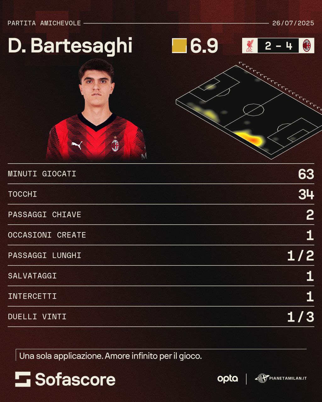 Andiamo a vedere la sua prestazione contro il Liverpool grazie ai numeri e alle statistiche di 'Opta' e 'Sofascore' per PianetaMilan. Per Bartesaghi 63 minuti in campo con 34 tocchi, 2 passaggi chiave e un'occasione creata in attacco. Un passaggio lungo riuscito su due, un salvataggio, un intercetto e un duello vinto su 3. Come vediamo dalla heatmap, Bartesaghi è rimasto in difesa, d'altronde doveva affrontare una stella assoluta come Salah. Non sono però mancate le sortite in avanti.