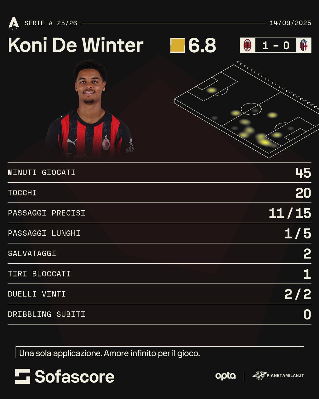45 minuti in campo per Koni De Winter che ha giocato in un ruolo non naturale per lui, ovvero quello da braccetto sinistro. 20 tocchi con 11 passaggi precisi riusciti. Un passaggio lungo riuscito su 5. Due salvataggi e un tiro bloccato. Due duelli vinti su due.