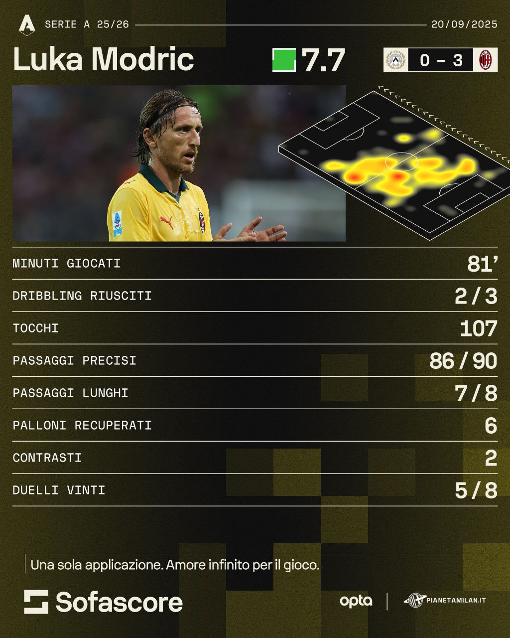 Luka Modric sta sorprendendo tutta la Serie A: in estate, quando si è parlato di un suo possibile arrivo a Milano, molti tifosi e addetti ai lavori avevano espresso i propri dubbi, soprattutto riguardo l'età e la tenuta fisica del croato. Modric, in questo suo inizio con il Milan, sta silenziando tutti questi dubbi. Come detto, Luka è sempre tra i migliori in campo per il Milan e quello che sorprende è come i compagni lo cerchino con continuità. Non è un caso che Modric abbia toccato più di 100 volte la palla contro l'Udinese.