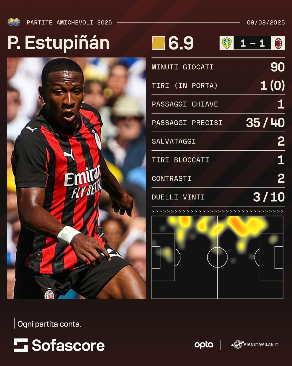 Andiamo a vedere la sua prestazione contro il Leeds grazie ai numeri e alle statistiche di 'Opta' e 'Sofascore' per PianetaMilan. 90 minuti in campo per Estupinan con un tiro, non in porta, un passaggio chiave, 35 passaggi precisi riusciti, 2 salvataggi, un tiro bloccato, due contrasti e 3 duelli vinti su 10. L'ultimo dato un po' preoccupa. Come possiamo vedere dalla heatmap, Estupinan ha giocato spesso in avanti, senza rinunciare ad attaccare spesso dialogando con Okafor e Chukwueze.